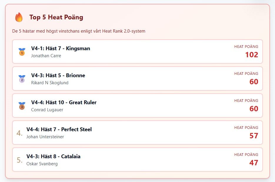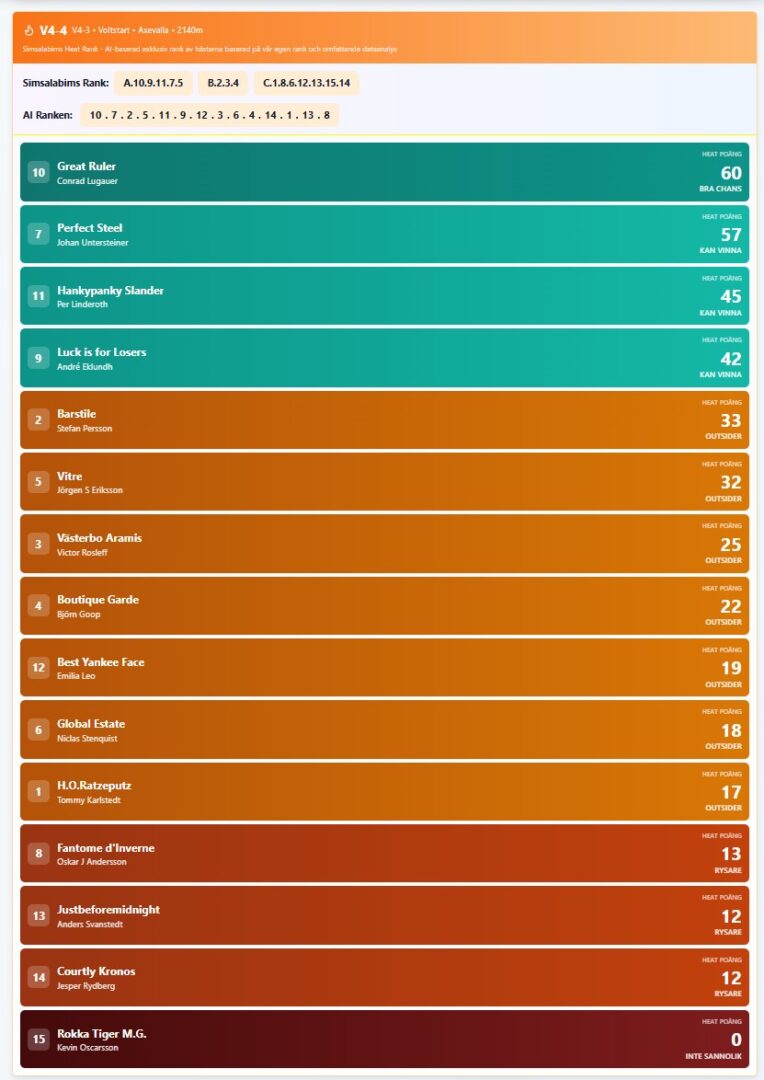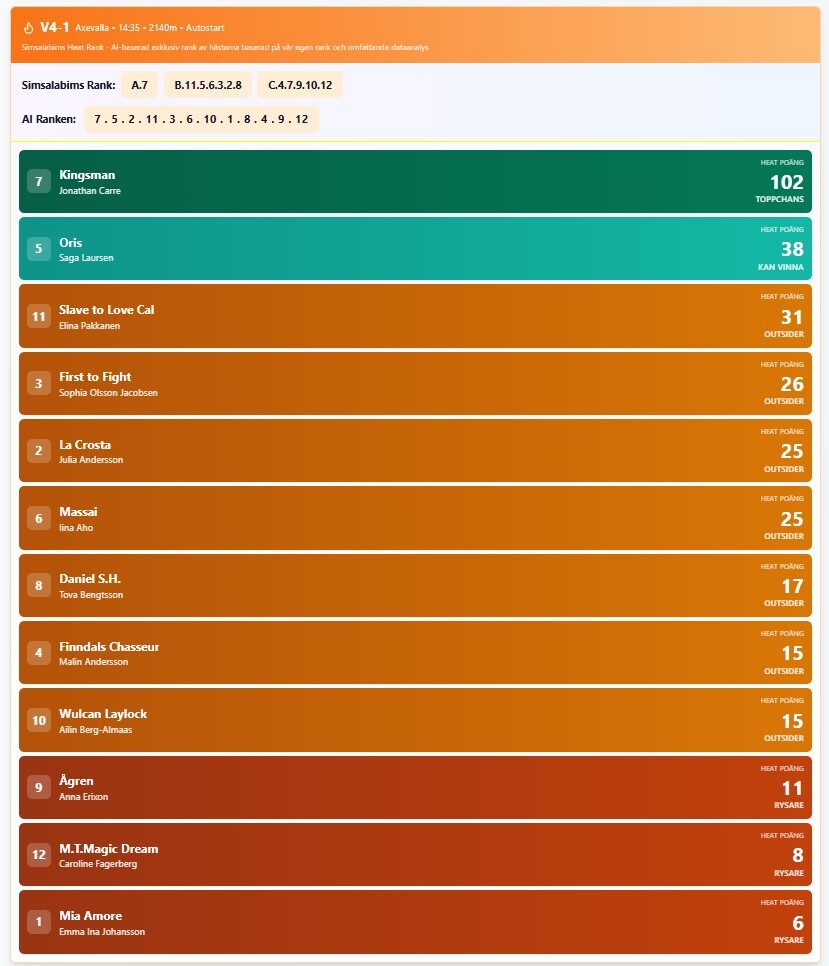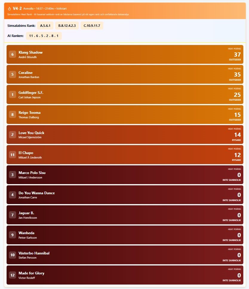 Våra V4 andelar bara fortsätter leverera vinster och vi ser fram mot dagens omgång från Axevalla. Jobbet med helt nya sätt att ranka lopp med hjälp av våra experter tillsammans avancerade AI analyser fortsätter. Här får du ett smakprov på vår Heat Rank som kommer framöver.