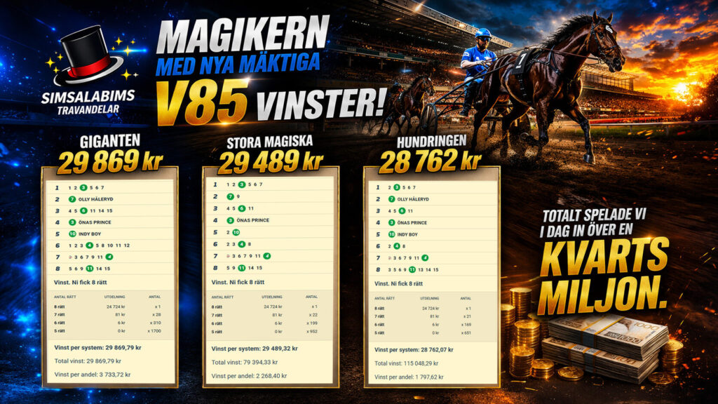 Vi spelade in över kvarts miljon i lördags på våra V85 andelar och det var Giganten, Stora Magiska och Hundringen som levererade de största vinsterna. I dag är det dags för V85 igen och det är Bollnäs som står som värd för omgången. Jackpot och hela 46 miljoner i potten.